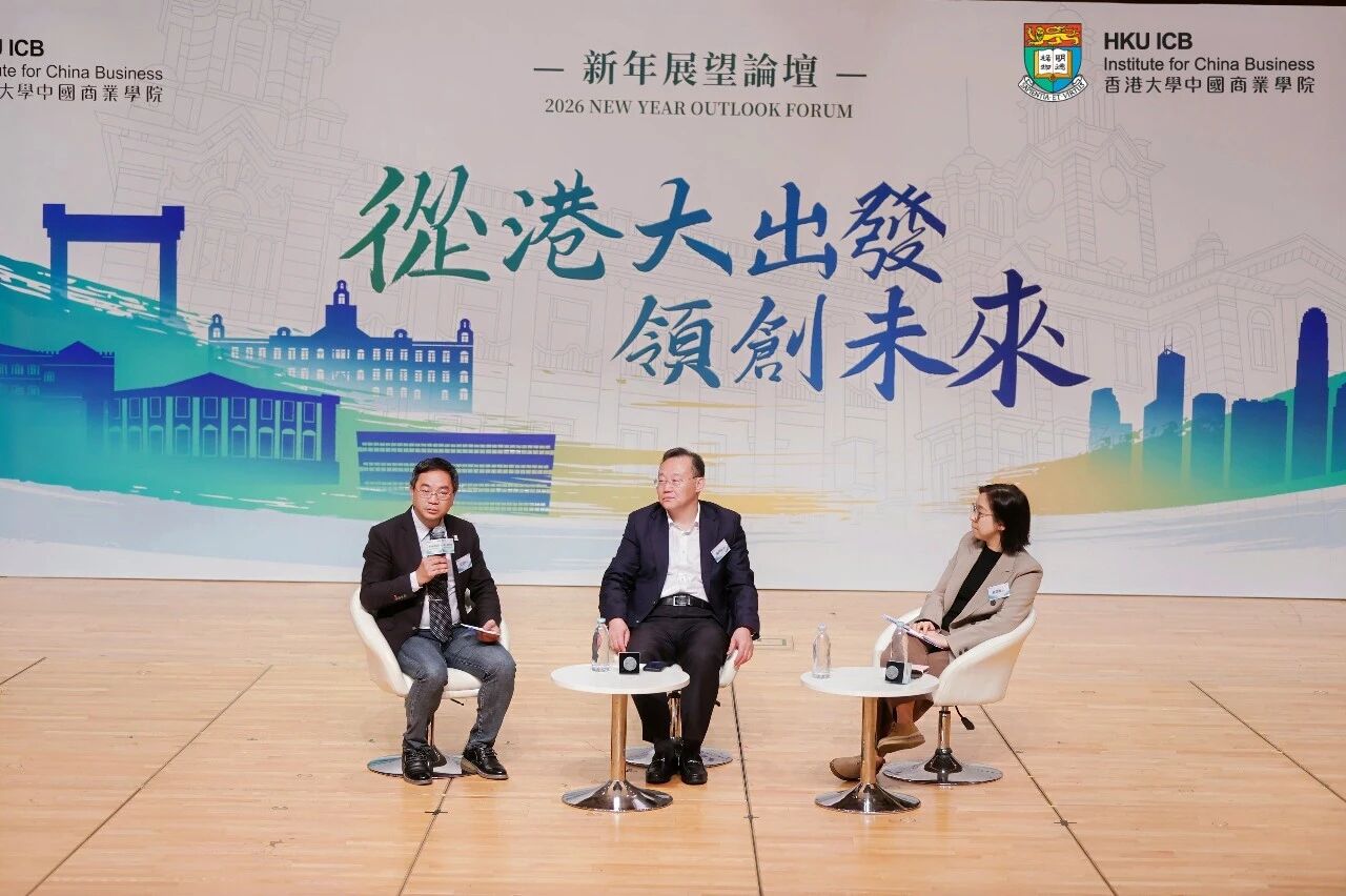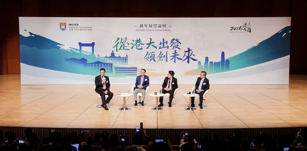 2026年1月18日,香港大学中国商业学院"从港大出发 领创未来"新年展望论坛在港大百周年校园李兆基会议中心盛大举行。14位专家学者及行业领袖围绕创新科技、财经金融、企业出海、跨境法治四大议题展开深度研讨,吸引300余名校友及亲友参与。