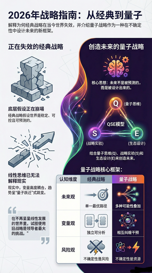 我将用QSE模型,量子战略的“三角支架”:量子思维Q、战略实验S、生态设计E,带你重新理解:企业如何在不确定性中“凿出”未来,而不是被动等待未来。