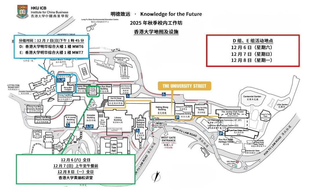 下图为港大校园平面图,点击图片查看大图,建议保存图片,方便查看路线。