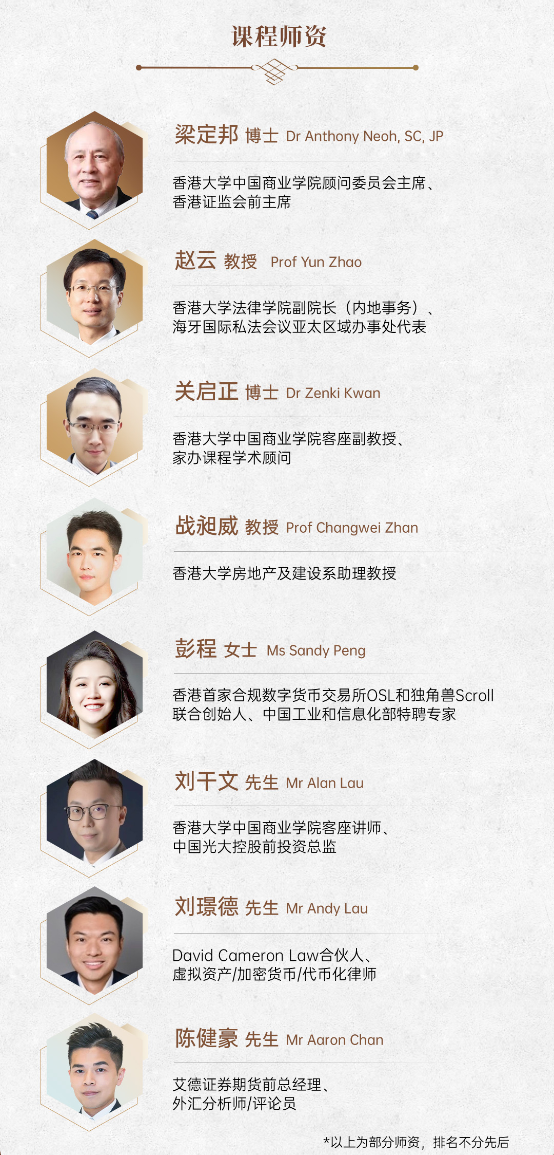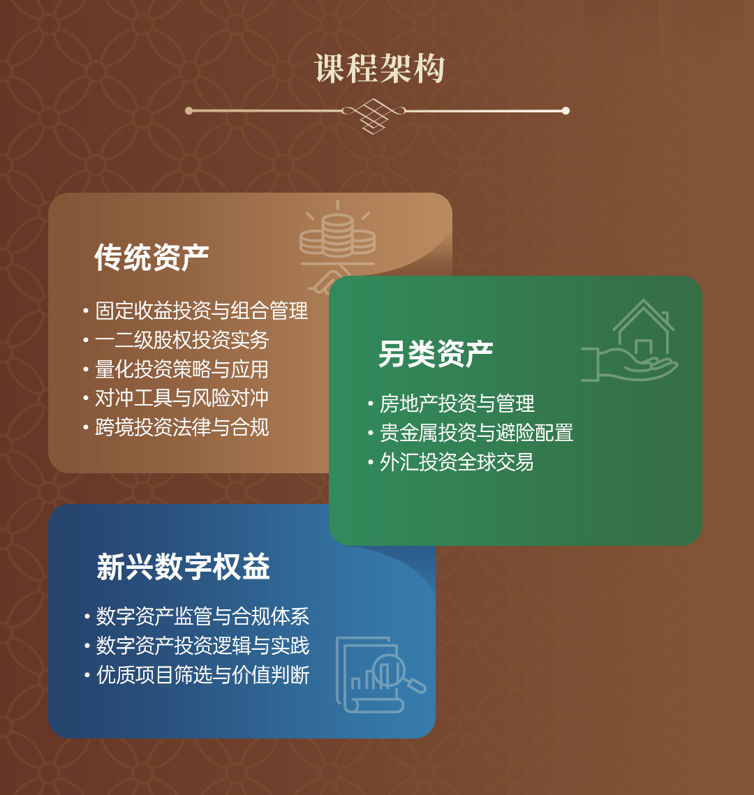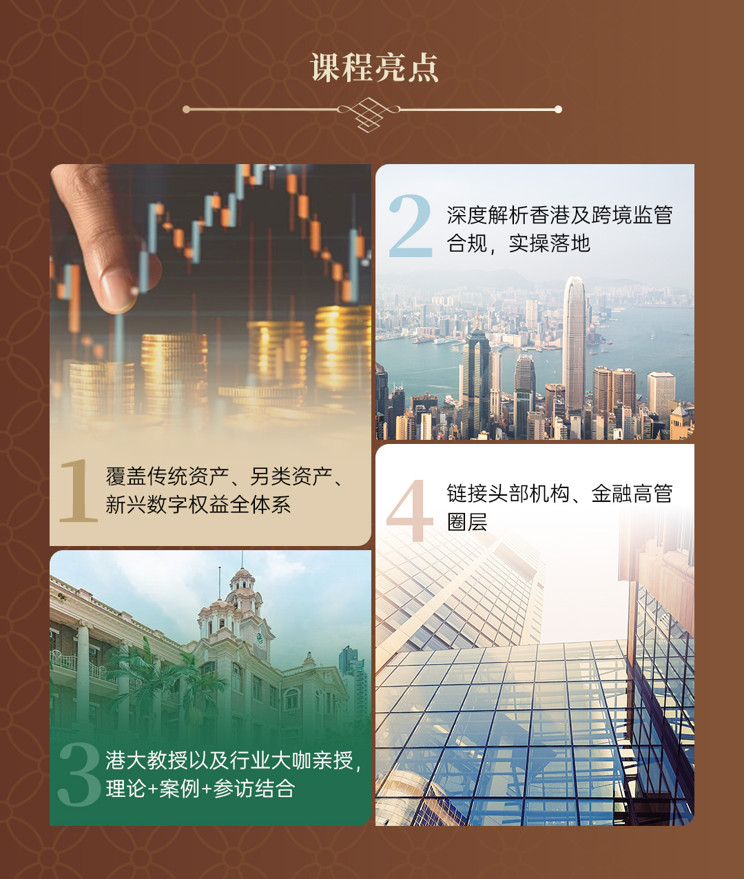 Technology is reshaping the way assets are managed. A balanced approach to traditional assets, alternative assets, and digital assets has become key to preserving and growing wealth across generations. As the global wealth management market expands, professionals need stronger skills to manage the full lifecycle of different asset types and seize new opportunities. Many challenges remain. Professionals often lack a clear understanding of regulations, practical operating methods, and compliance risks. There is strong demand for an integrated solution that combines theory, practice, and resources. As a global financial centre and family office hub, Hong Kong benefits from its unique advantages under One Country, Two Systems and a clear regulatory framework. It connects the Chinese mainland with global markets, providing a compliant environment for diversified family wealth management and innovation. This programme takes a Theory-Practice-Resources approach. Supported by Hong Kong's strengths, it provides comprehensive training in managing traditional, alternative, and digital assets, helping professionals upgrade their skills and adapt to industry changes. |