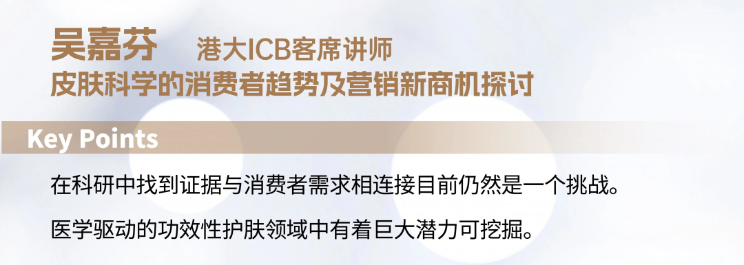 皮肤健康产业,被称为“韧性最强”的新经济力量之一,有老选手唱罢黯然离场,亦有新人躬身入局。究竟是行业发展影响市场风向,还是消费者需求决定行业趋势?9月16日,一场香港大学中国商业学院(简称港大ICB)X优麦科技联合举办的“皮肤健康科学营销新势能”讨论沙龙在优麦科技上海总部开展。这是一场关于从察觉市场动态到商业模式落地的探索讨论。港大ICB客席讲师吴嘉芬女士、优麦科技创始人/CEO常江先生(IMC SH7 班长)、优麦科技合伙人/消费品事业部总经理Nora女士(IMC SH7 校友)从不同角度阐述了对行业的理解。