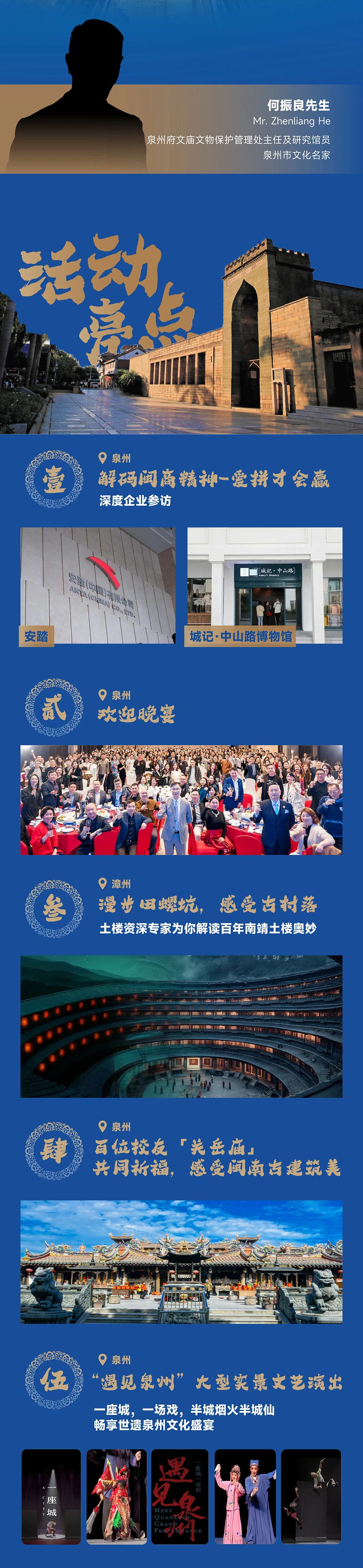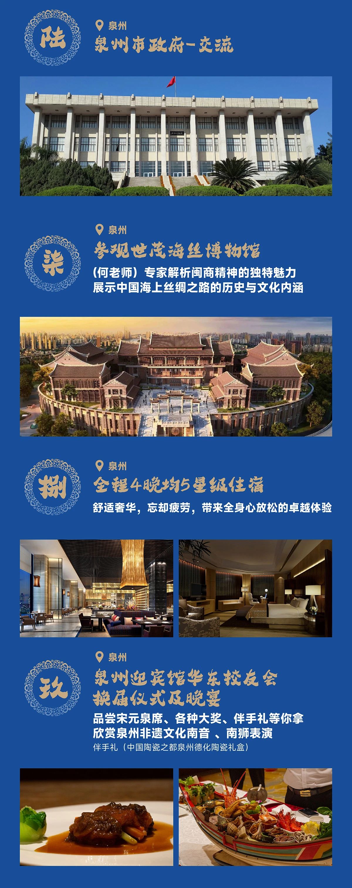 11月17日-21日,即将迎来华东校友会的换届,此次主题为“解码闽商精神,探索海丝文化”研学活动,我们诚意的邀请各位校友们一同走进闽南实地进行文化考察,携手各位校友们走进厦门、泉州、漳州三地。漫步云水谣,在土楼资深专家的带领下解读百年土楼的奥妙。参观中国最古老的清真寺,一同在泉州关岳庙祈福。一同观赏沉浸式畅享世遗《遇见泉州》大型实景表演。与泉州市文化名家共游海丝博物馆解析闽商精神的独特魅力。品鉴宋元海丝宴,欣赏泉州南音、南戏、南狮等最具本土特色的非遗文化。