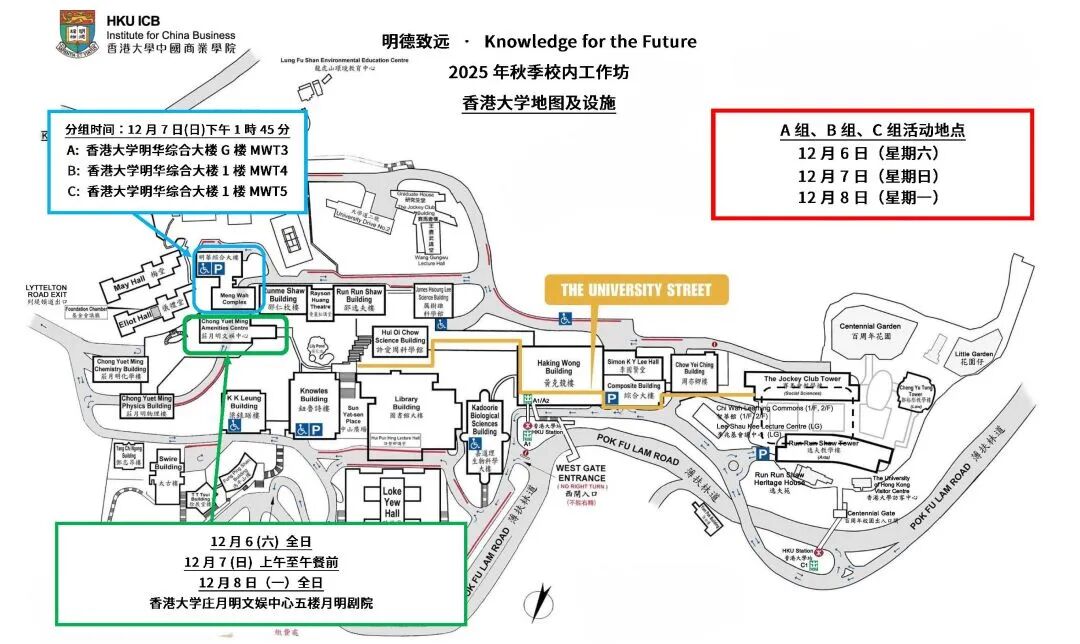 下图为港大校园平面图,点击图片查看大图,建议保存图片,方便查看路线。