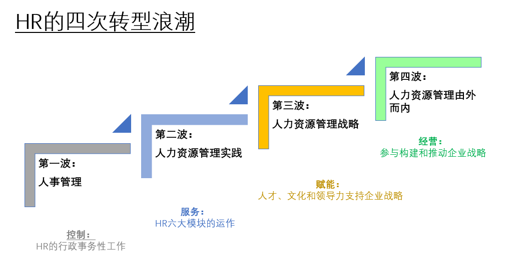 如果借用HR管理大师戴维•尤里奇的“HR四次转型浪潮”的表述,国内大部分企业HR已逐渐完成从“人事管理”向“人力资源管理实践”六大模块的运作转型,并逐步迈向“人力资源管理战略”,通过赋能人才、构建文化、提升领导力等举措支持企业的战略实施。然而,企业的CEO与业务领导者们更进一步期望人力资源管理者从“HR管理和专业视角”转变为“业务和经营视角”,创造更大的价值,实现“人力资源管理由外而内”战略型HR飞跃。